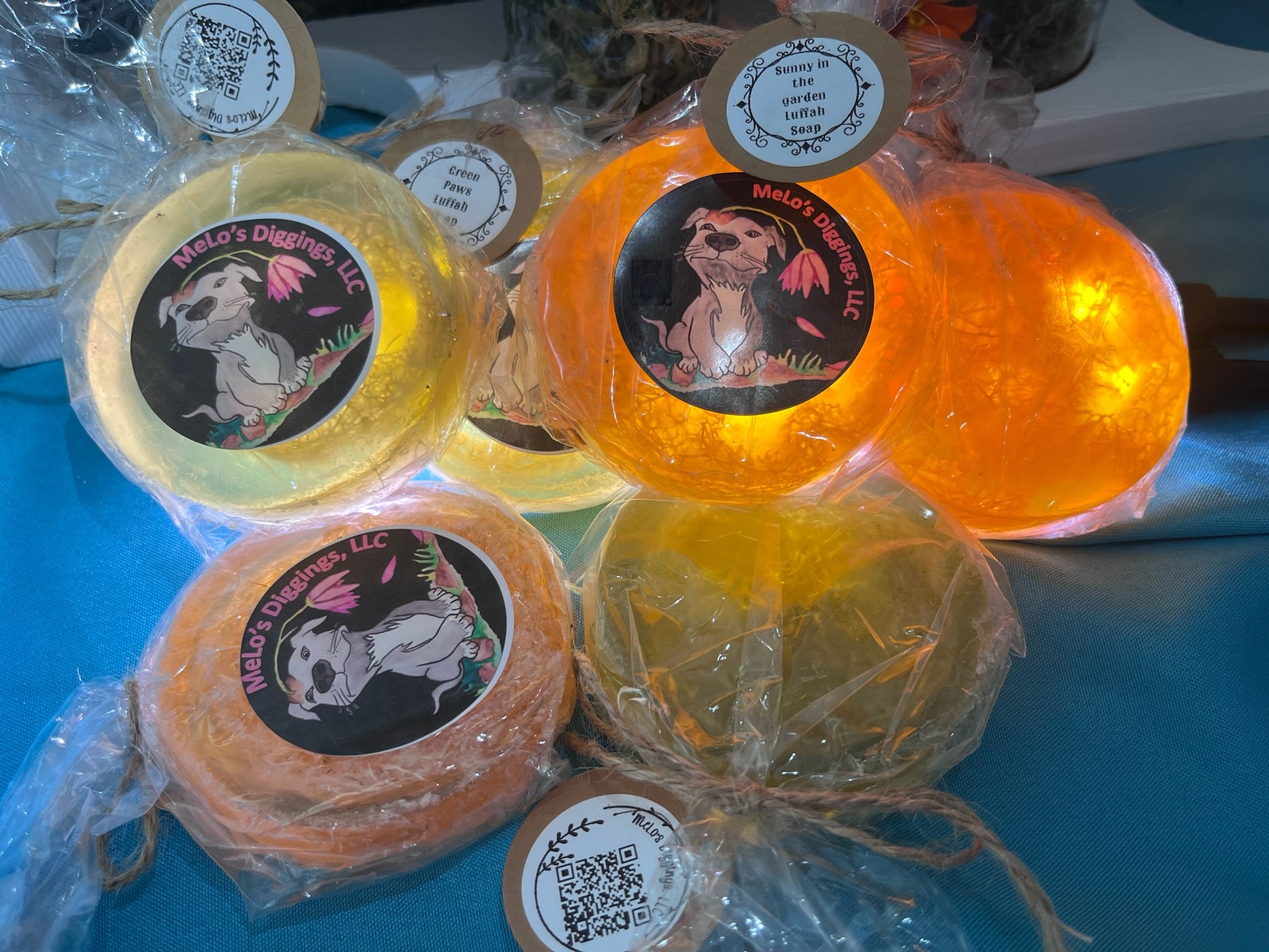 Made with loofahs grown right here in my garden, this soap bar scrubs like no other. I make these by cutting a large slice of one of my homegrown, all-natural loofahs and sink it right into the middle of the soap while it's still in liquid form. Once it solidifies, you have an amazing scrubby bar of soap!