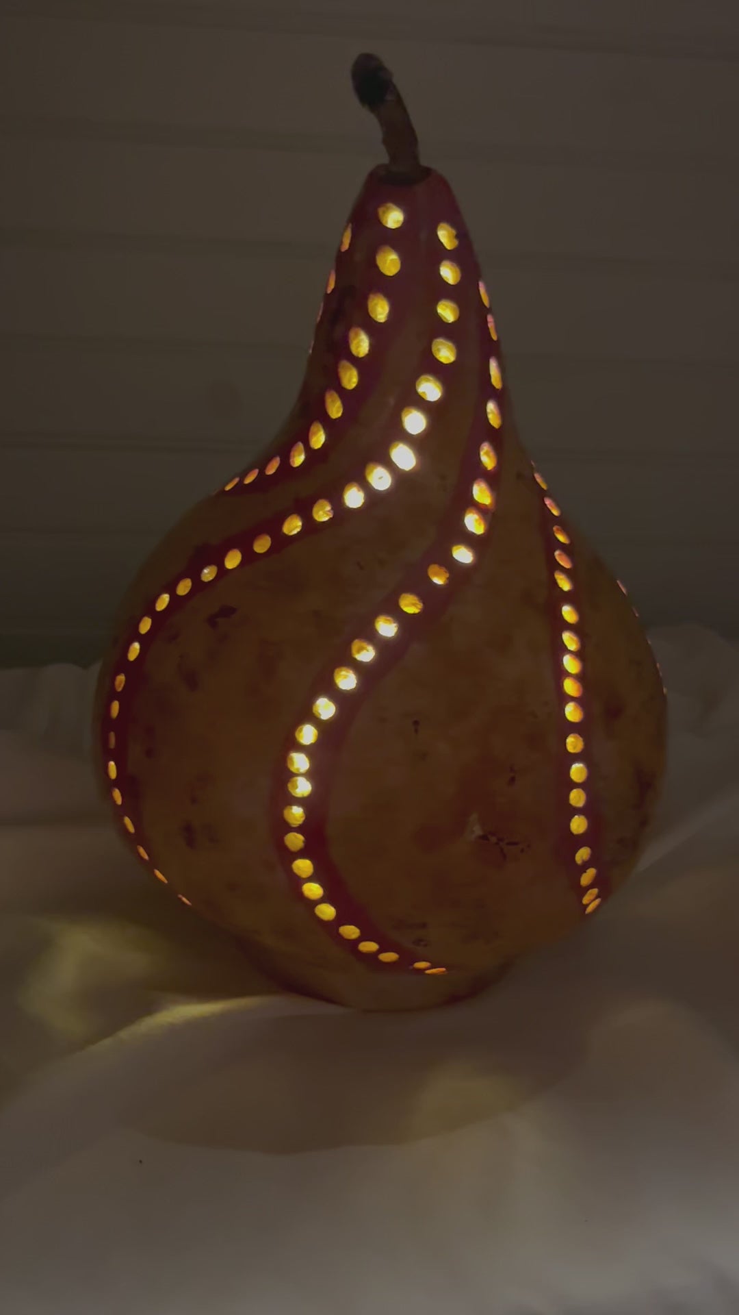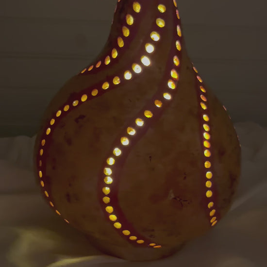 This lamp was lovingly handmade from a dried gourd grown in my garden and harvested by me. It takes several months for a gourd to properly dry. It was then cleaned and designed, hand carved and hand painted- a process that takes many hours.