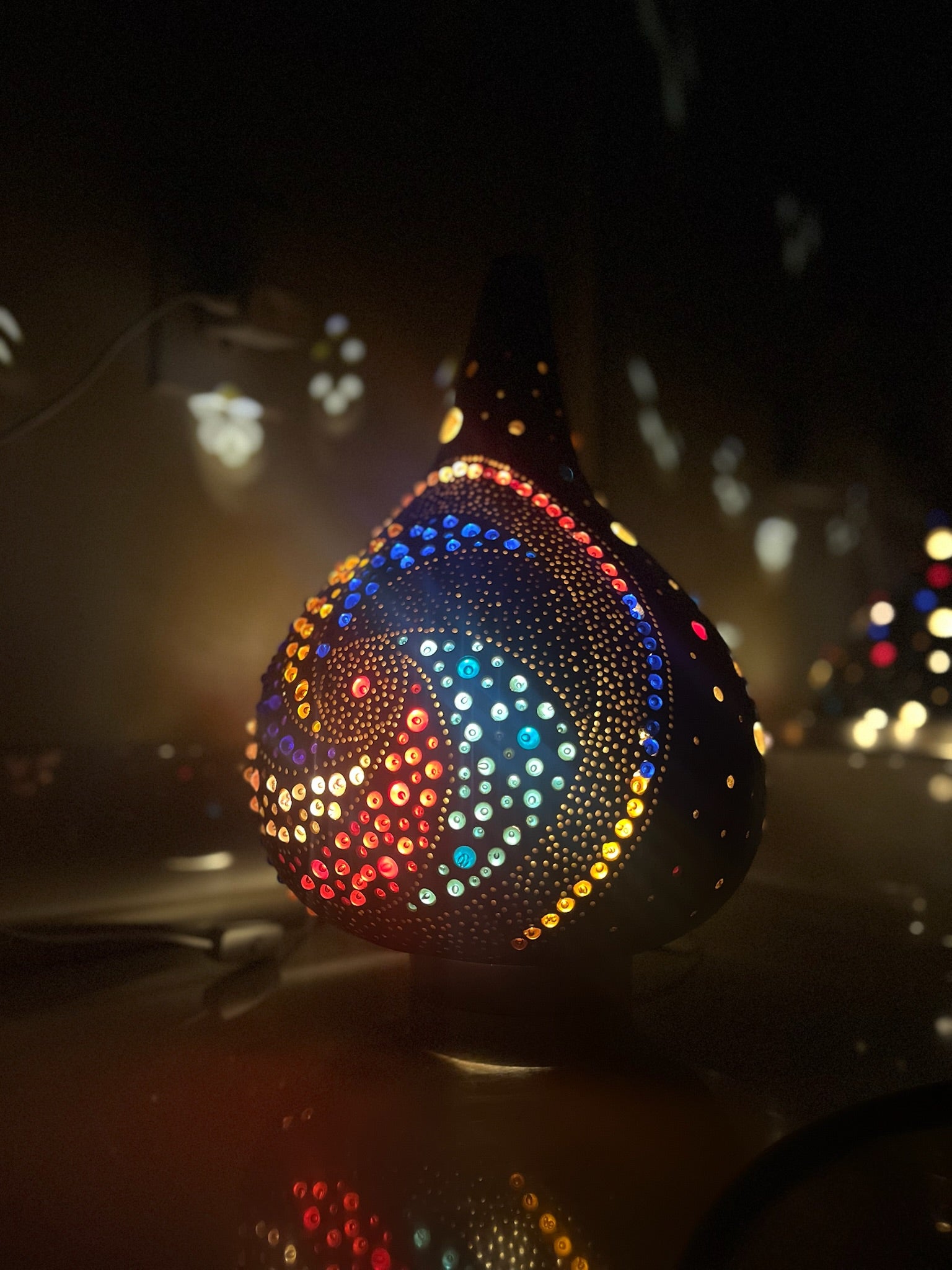 Each lamp is created from a natural gourd, carefully cleaned, carved, and transformed into a functional piece of art. Because no two gourds are ever alike, every lamp carries its own unique shape, texture, and personality. Patterns are hand-designed and cut, making each one a truly individual creation that can’t be replicated. Every piece is both rustic and artistic, blending nature’s form with warm light to bring character and atmosphere into your home.