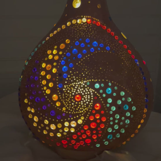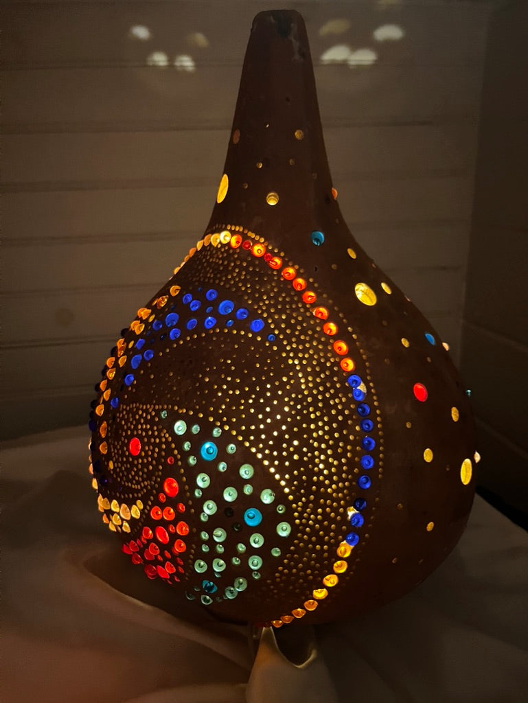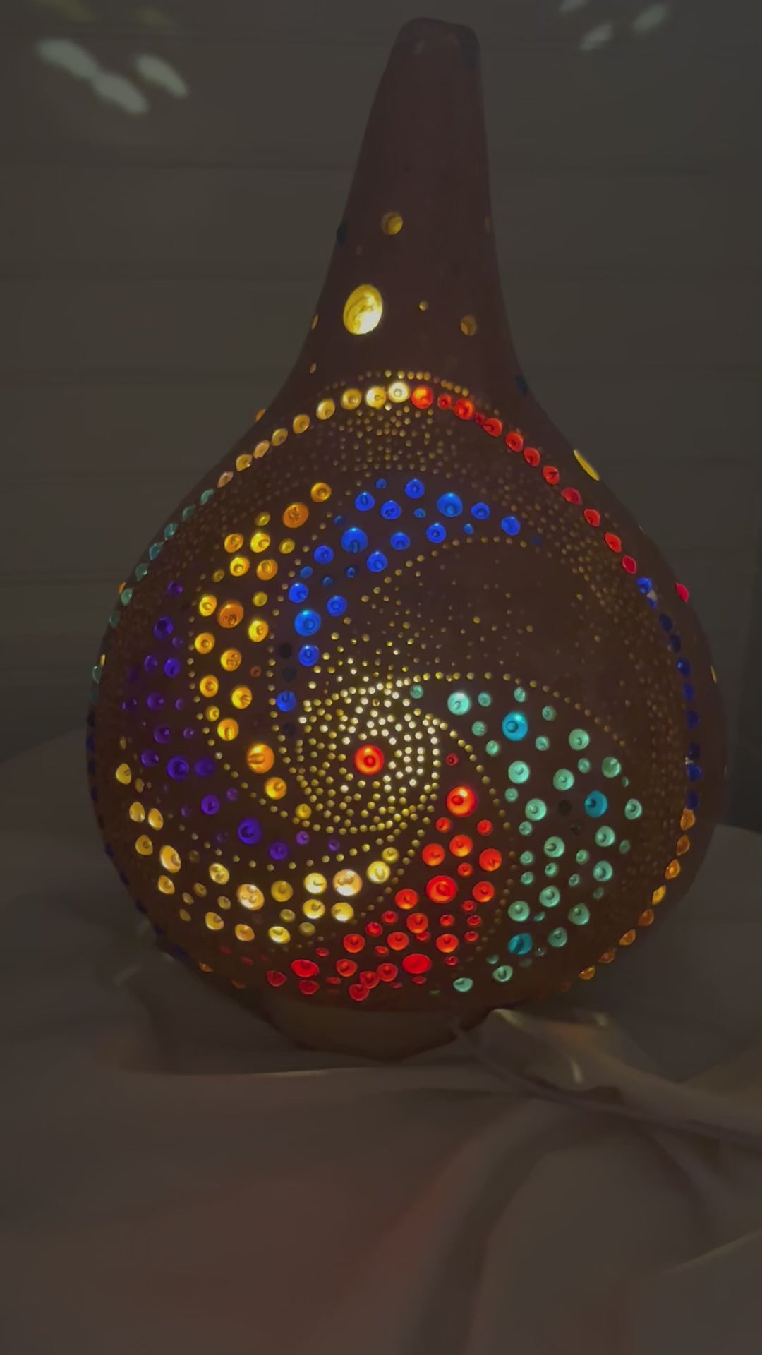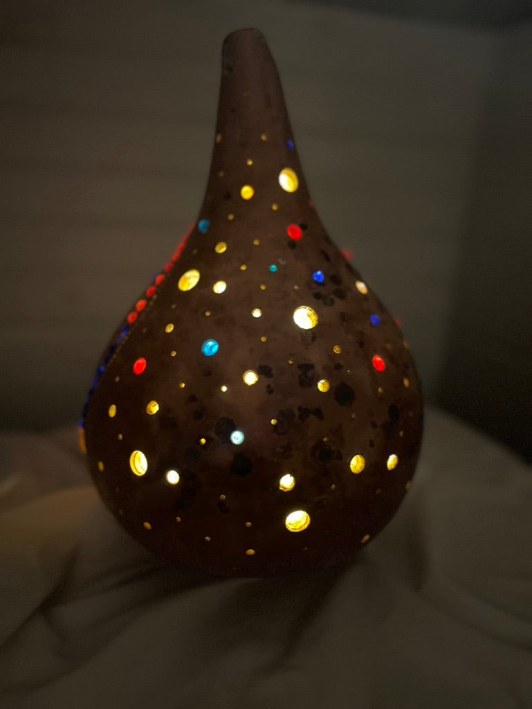 This lamp was lovingly handmade from a dried gourd grown in my garden and harvested by me. It takes several months for a gourd to properly dry. It was then cleaned and designed, hand carved and hand painted- a process that takes many hours.